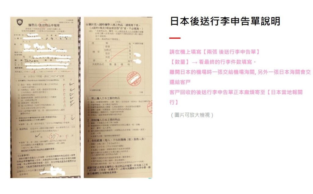 入境日本時後,需提供以下資訊,以便屆時報關的進行。